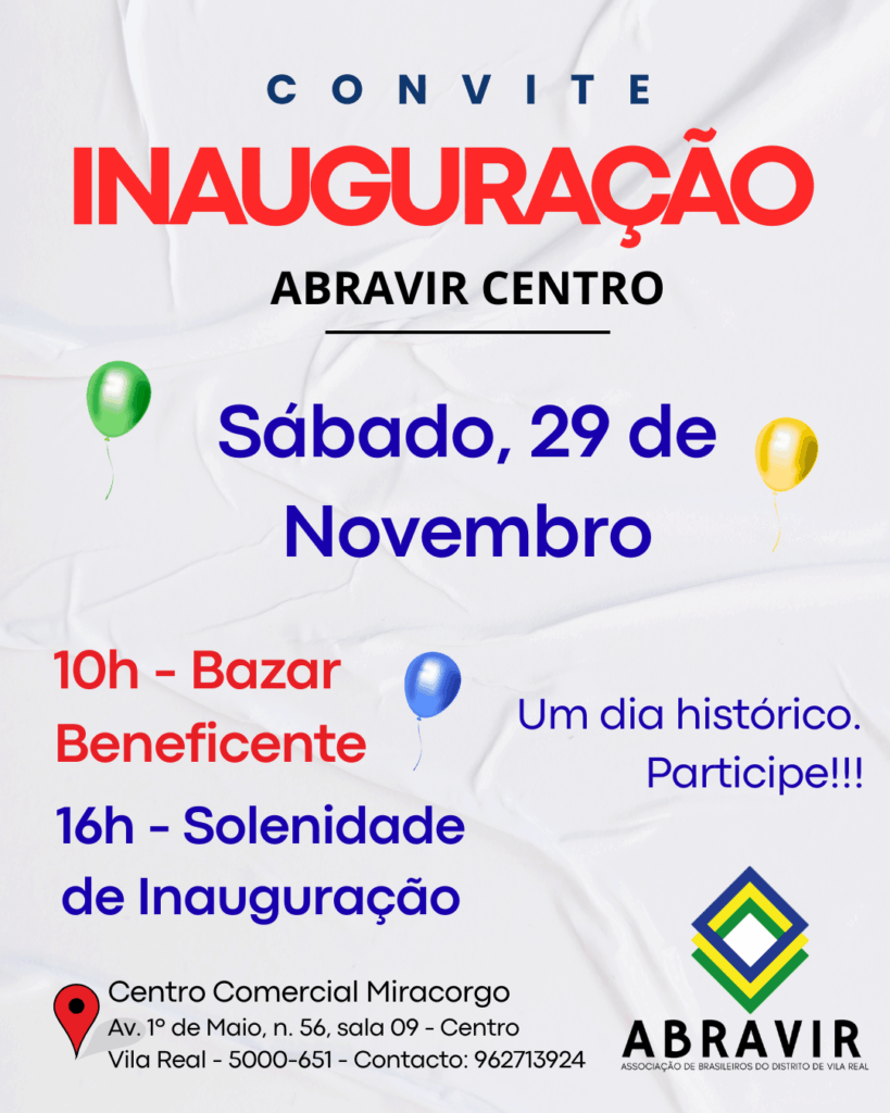 A Abravir tem o prazer de anunciar a inauguração de sua nova sede, a Abravir Centro, que acontecerá no próximo dia 29 de novembro de 2025, no Centro Comercial Miracorgo. Este espaço foi cuidadosamente preparado para acolher a todos com carinho e será um ponto de encontro para a comunidade.